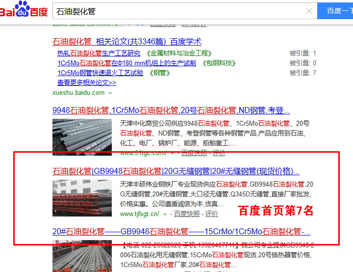 關鍵詞“石油裂化管”在百度排名:第一頁第七名