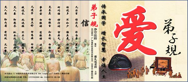 弟子規總序開篇是這樣教育我們的:弟子規,圣人訓,首孝悌,次謹信。泛愛眾,而親仁。有余力,則學文。它從人之根本出發,教育我們要從這幾個方面對自身進行德行的塑造。首孝悌,就是說做人首先要心中有愛,要孝敬父母。一個人如果連對他有養育之恩的父母都不能尊敬的話,那么他就喪失了做人的根本,對長輩、對領導、對同事、對兄長、對朋友就更談不上發自內心的尊重,他所做的事情也就很難得到認同。次謹信,告訴我們做人要謹慎,要講信用,也就是要誠信為本。小到一個人、大到一個企業,如果不能誠實待人,那么他依靠什么立足社會呢?泛愛眾,而親仁。有余力,則學文。意思是和大眾交往時要平等仁和,要時常親近有仁德的人,向他們學習,以上這些事是學習的根本,非做不可。如果做了還有余遐,還要學習一些其它方面的知識充實自己。這是教育我們如何待人處事、如何學習,要經常學習別人的長處,來彌補自己的缺點,從各個方面來約束自己,提高自身的素質和修養。